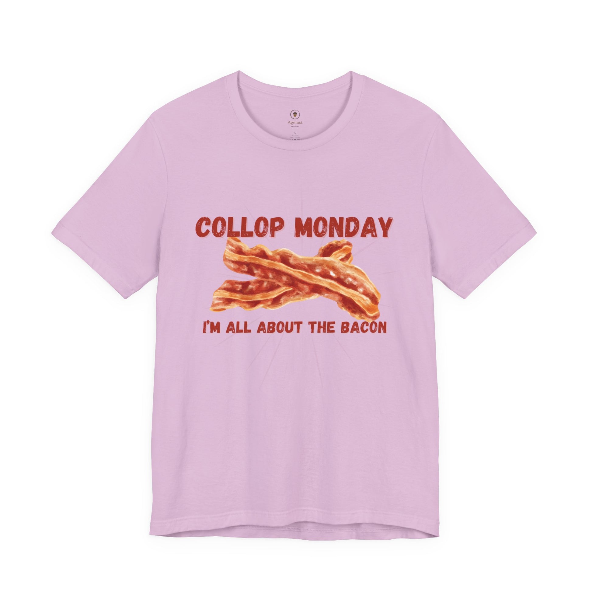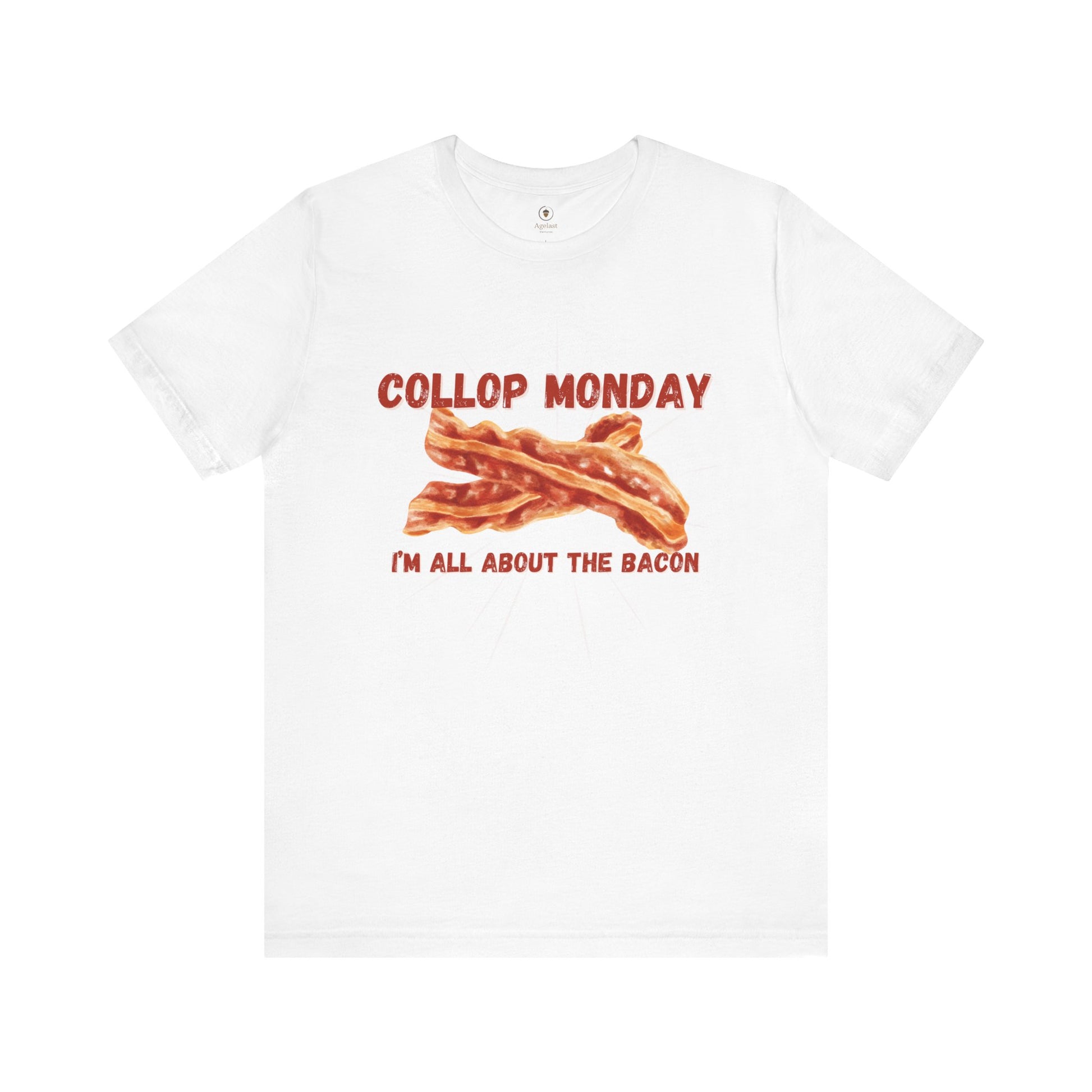 Celebrate Collop Monday by wearing this shirt while you rid your house of bacon. Perfect for those who love bacon and enjoy traditional celebrations. The best Monday of the entire year. This is the day it is traditional to rid the house of the bacon in advance of Shrove Tuesday. The way to rid your house of bacon is to eat it! What a concept. And if you don't have any bacon in your house, then go get some in advance, then fry it up and eat it. Wear this shirt while you eat the bacon to experience the satisfaction of a job well done.