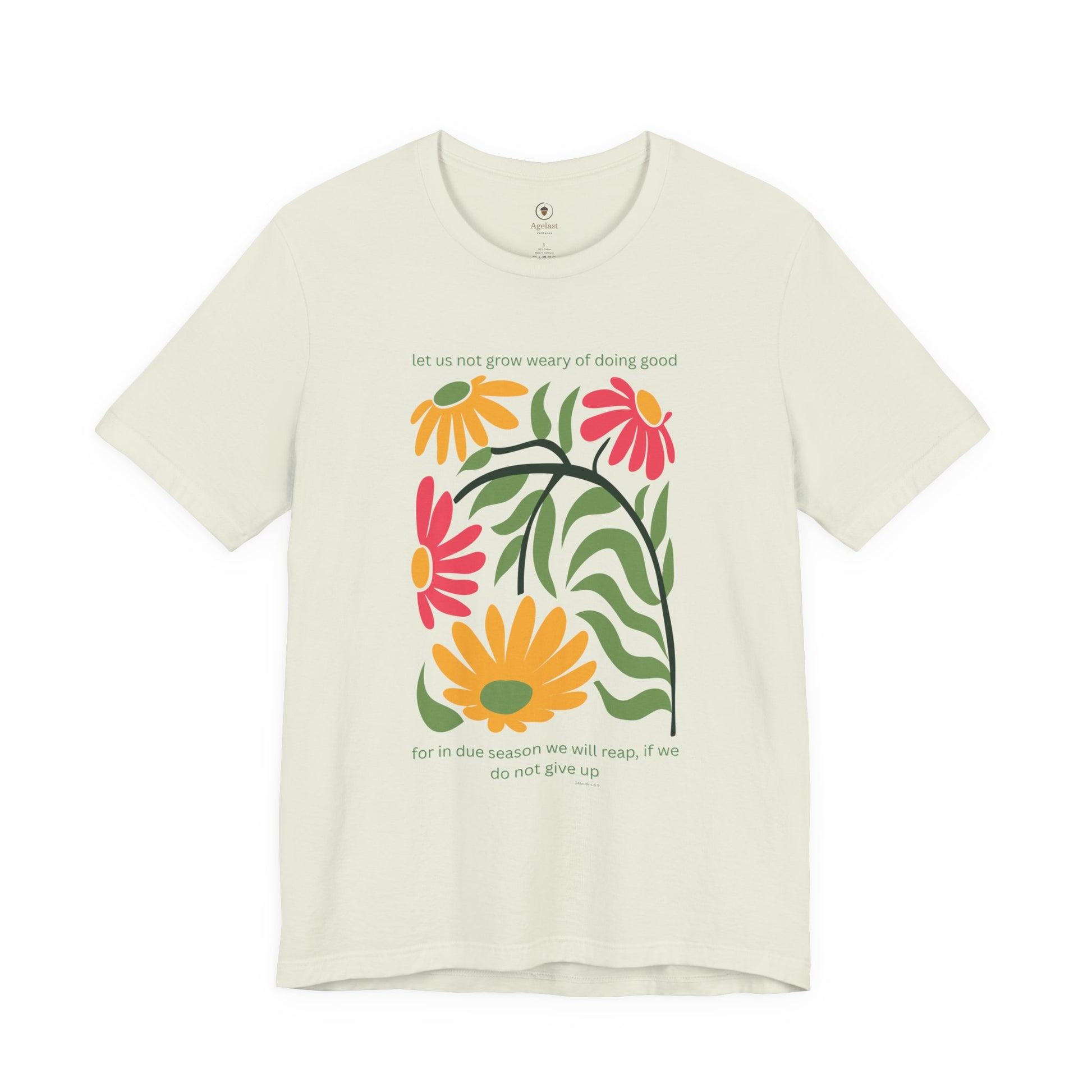 Galatians 6:9 -- ideal for those who enjoy sparking conversations and sharing their faith. This shirt gives off a casual and laid-back vibe, perfect for everyday wear or casual gatherings. Also great for formal events (if you think you can get away with it).