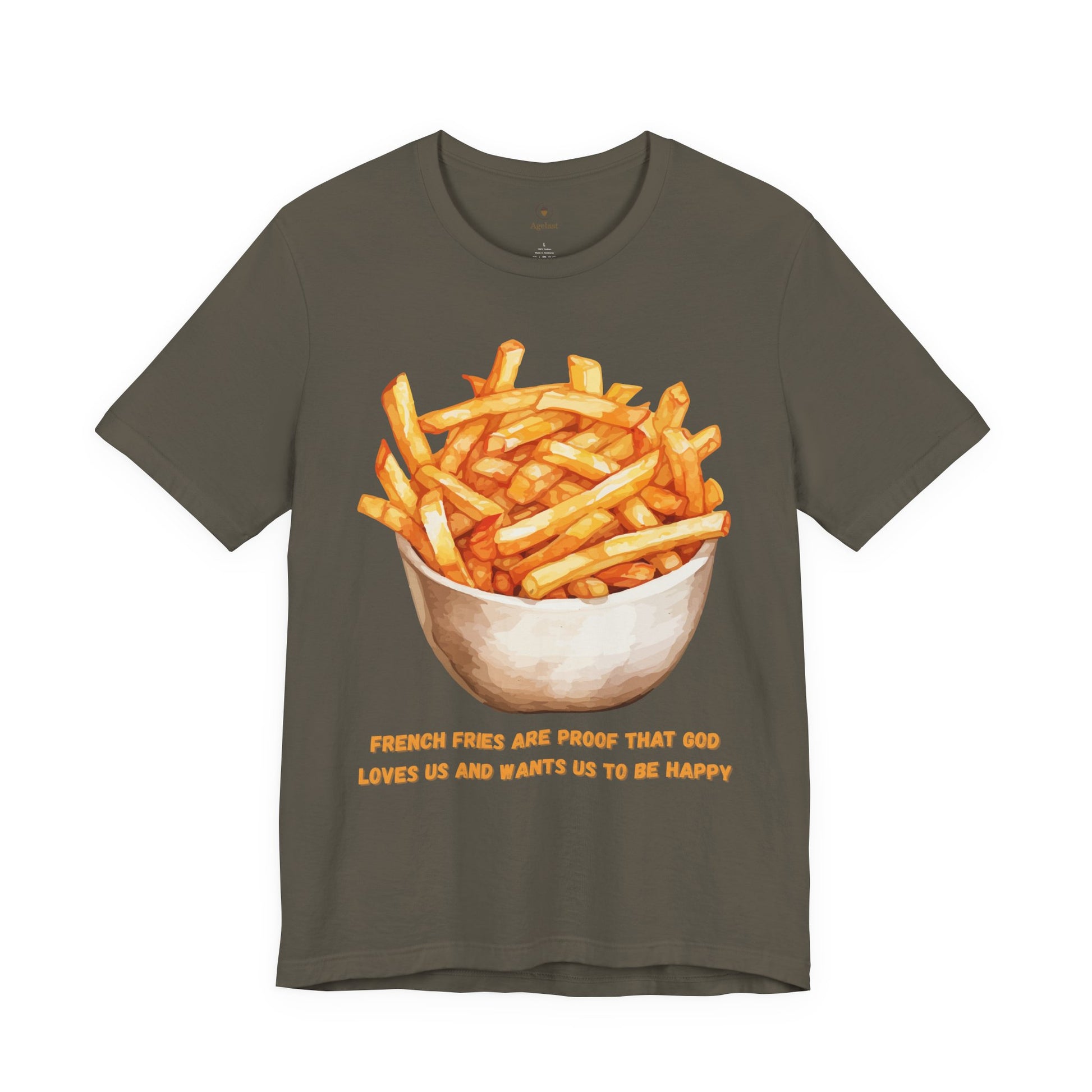 French Fries are indeed evidence God wants us to be happy. Their warm golden goodness is surely a reflection of the world to come. This shirt is ideal for those who enjoy sparking conversations and sharing their faith. Also great for starting conversations about the versatility of the trusty spud. This shirt gives off a casual and laid-back vibe, perfect for everyday wear or casual gatherings. Also great for formal events (if you think you can get away with it).