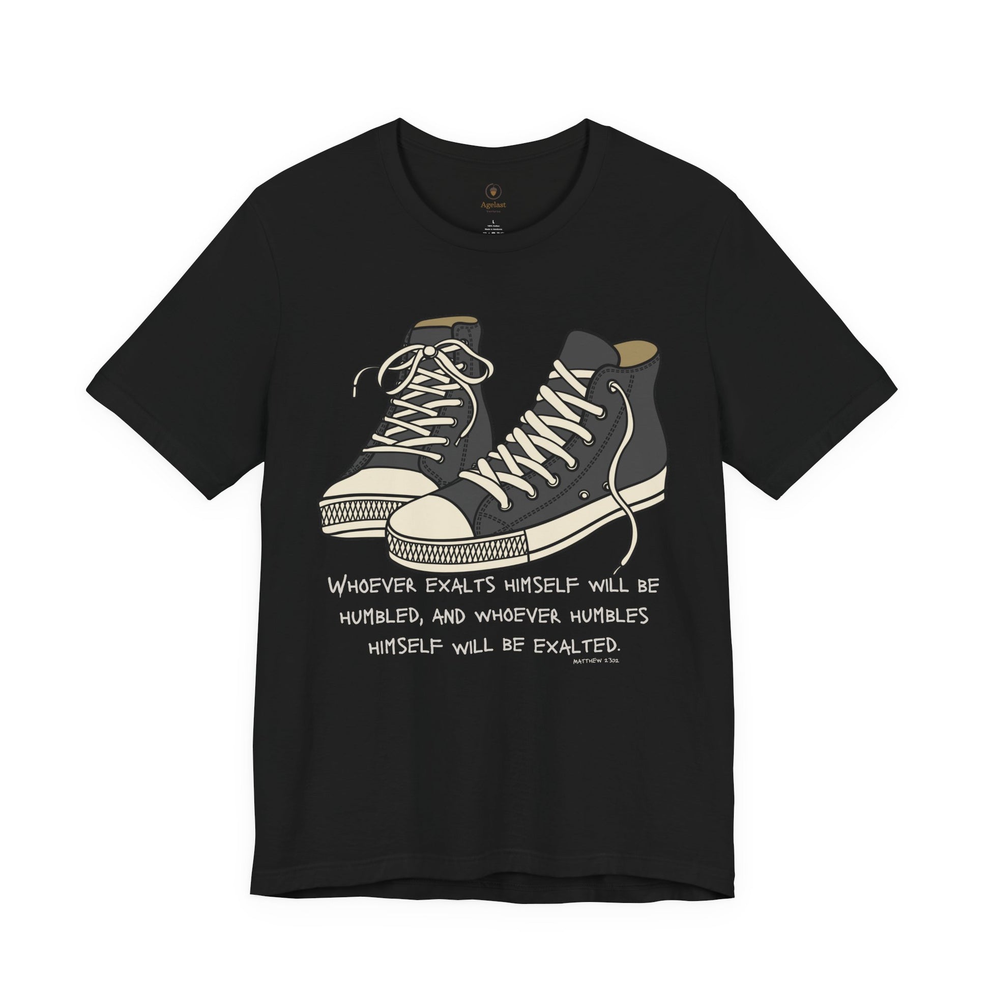 Matthew 23:12. Lace up your kicks and slip on this tee, then go out and mingle. This shirt gives off a casual and laid-back vibe, perfect for everyday wear or casual gatherings (and formal gatherings if you can get away with it) . Ideal for those who enjoy sparking conversations and sharing their faith. Wear this T Shirt with or without shoes.