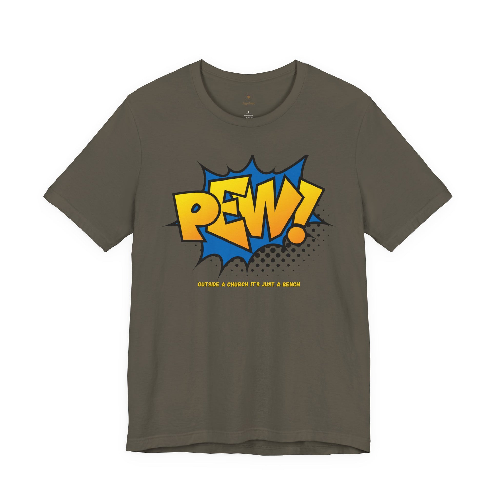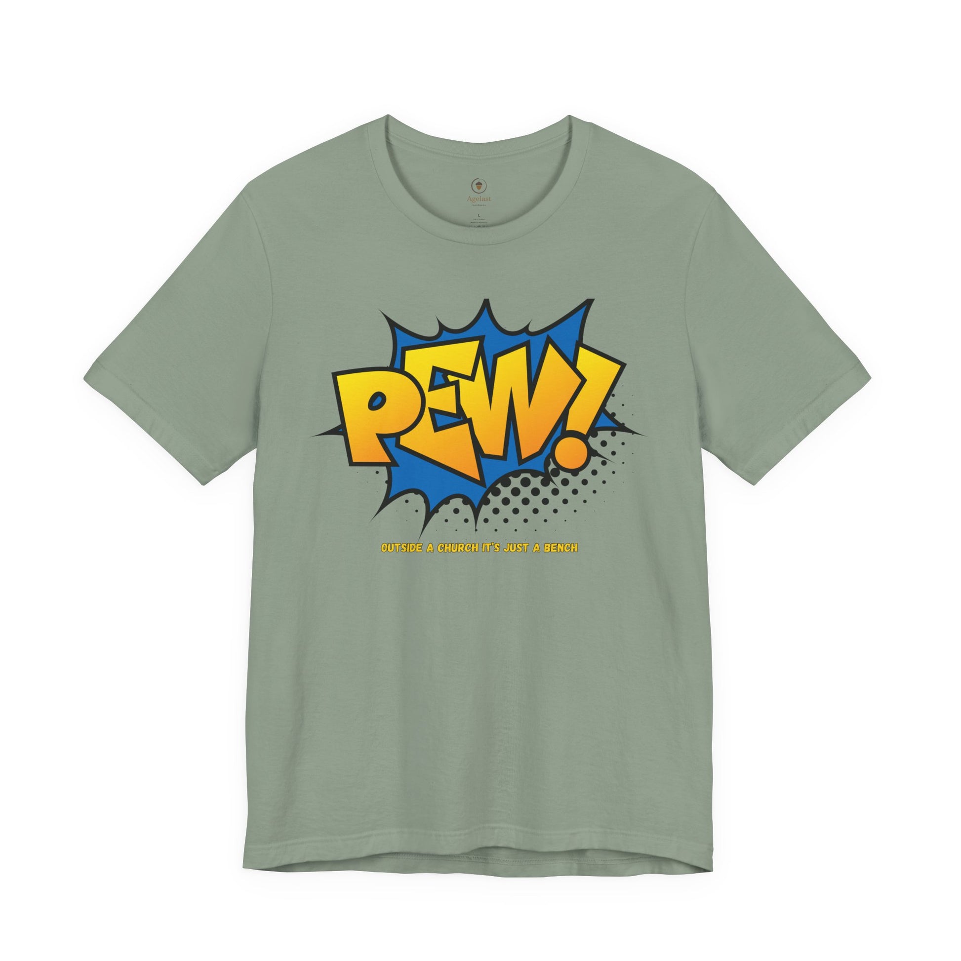 What makes a pew a pew? Outside a church it's just a bench. This shirt is perfect for everyday wear or casual gatherings. Also great for formal settings (if you can get away with it). Ideal for those who enjoy sparking conversations and sharing their faith.