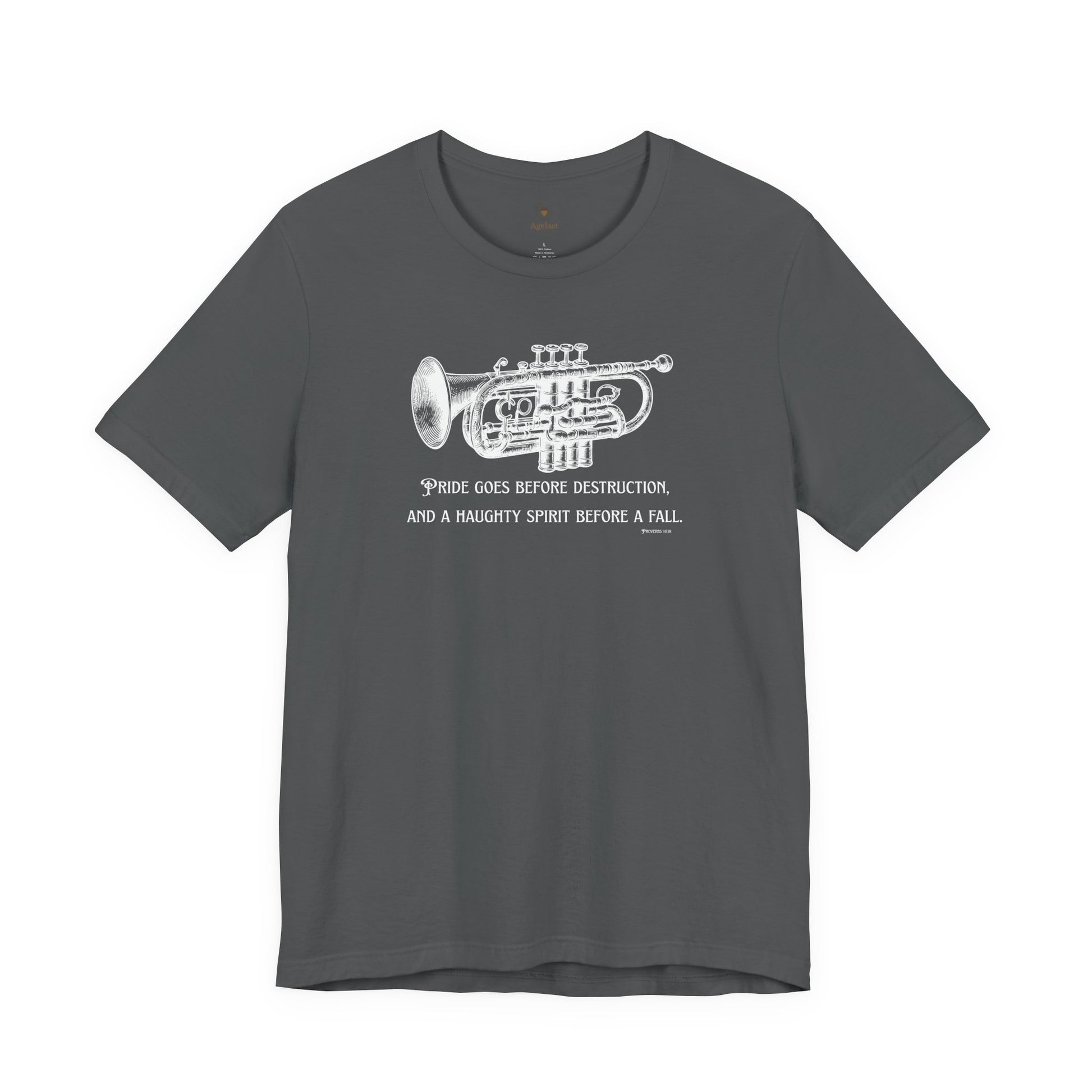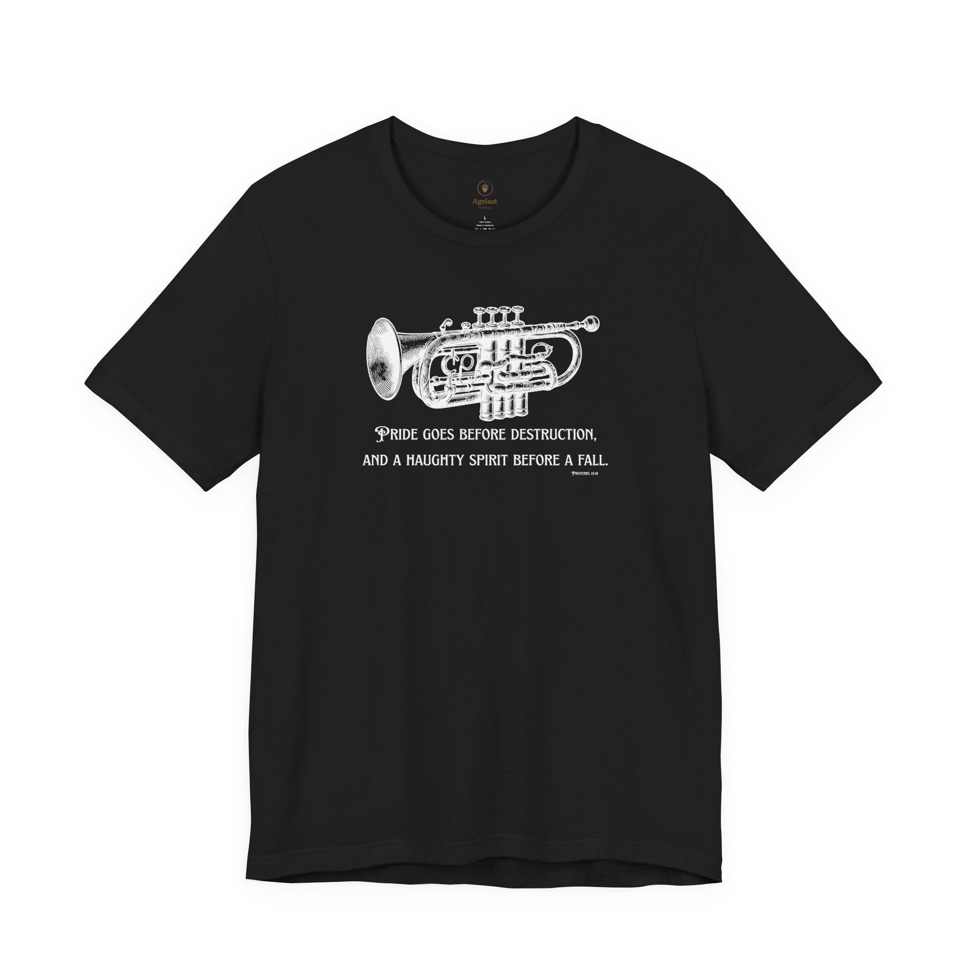 Proverbs 16:18 -- a terrific gift idea for any brass player in your life even if they aren't particularly proud. This shirt is perfect for everyday wear or informal gatherings. Also great for formal events such as high school band concerts, charity auctions, and weddings (if you think you can get away with it).