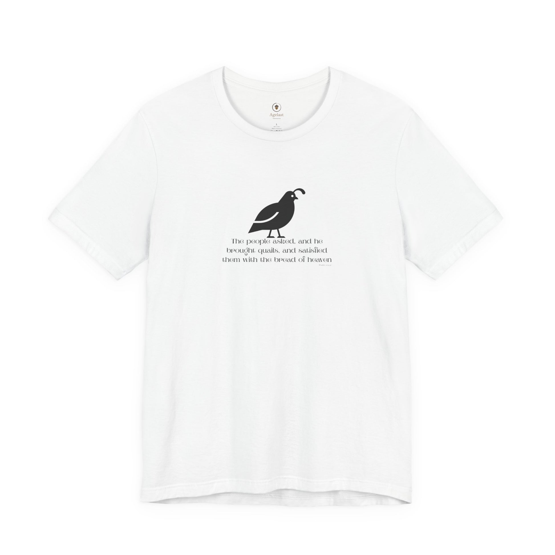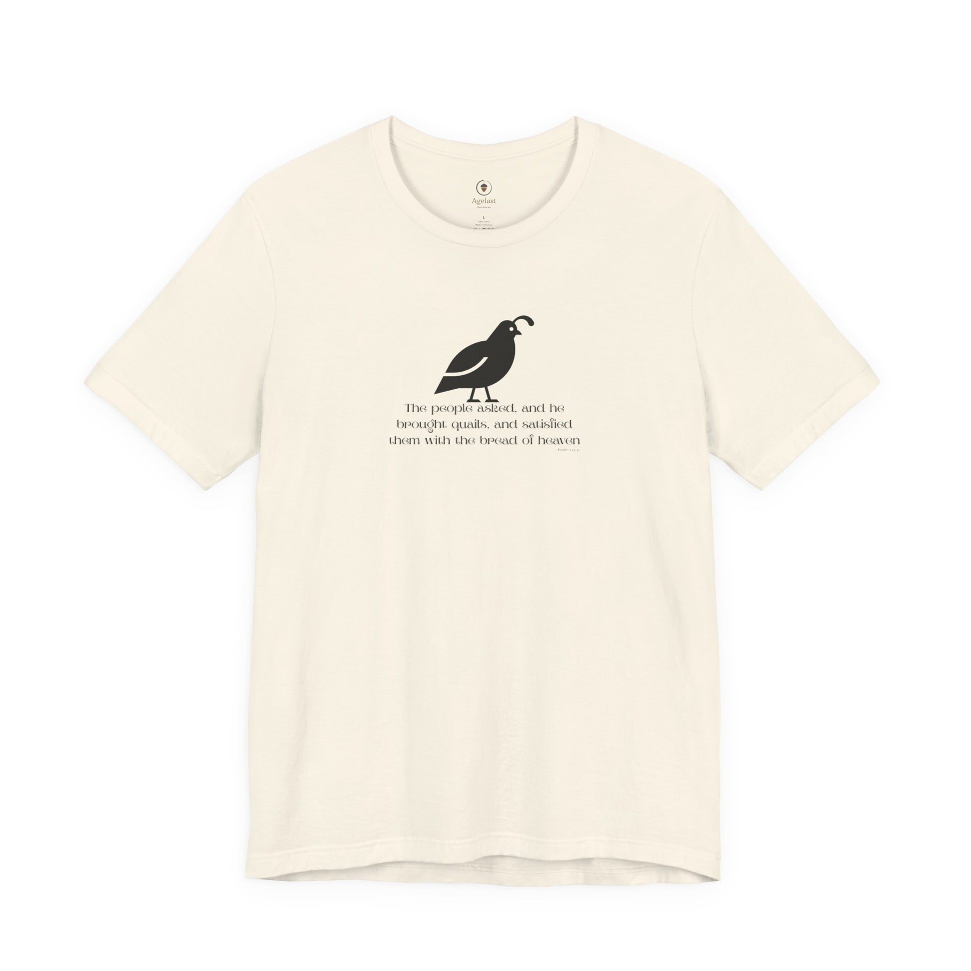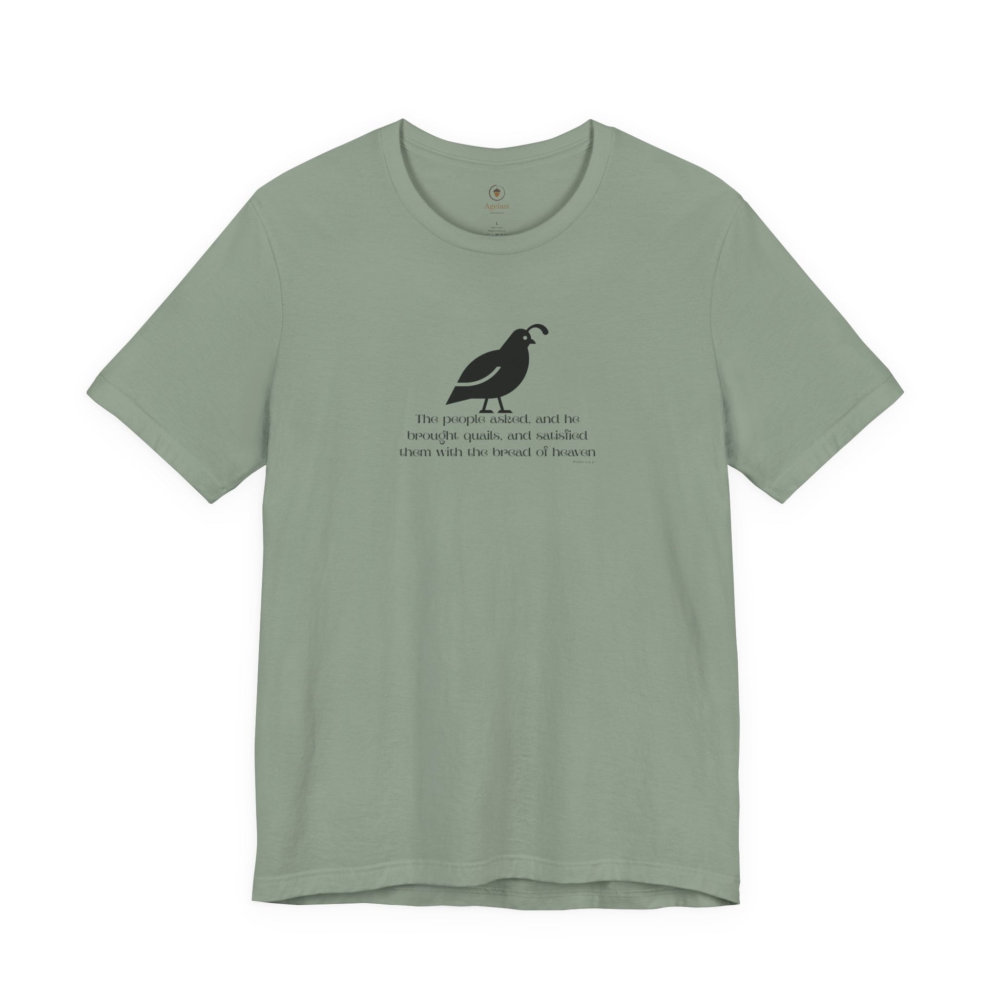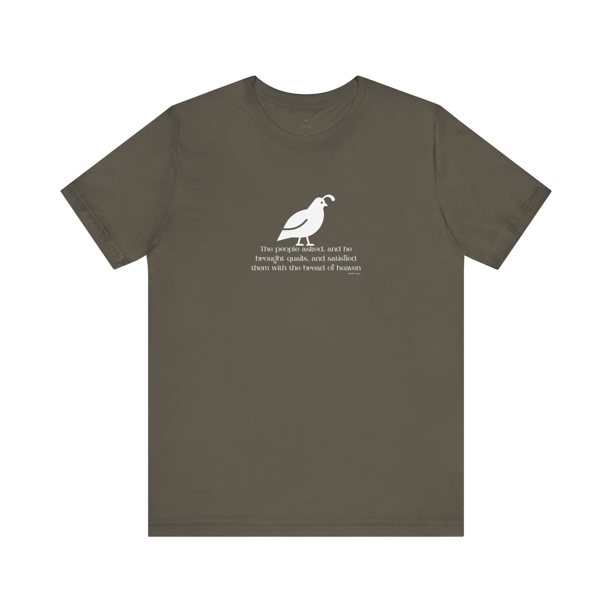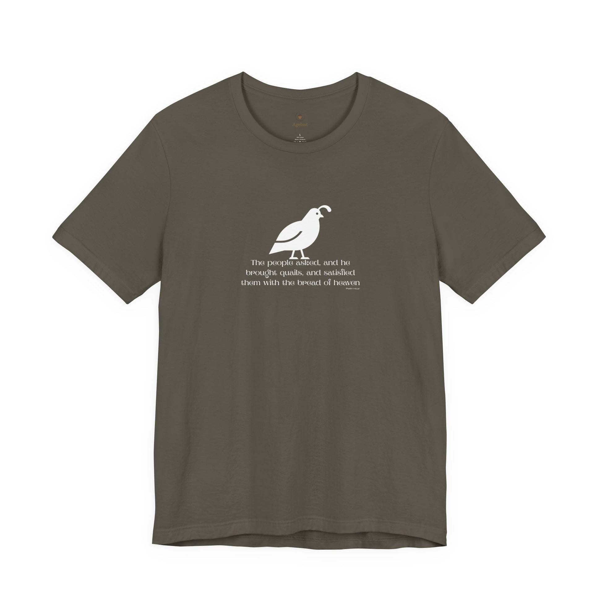 Psalm 105:40 -- ideal for those who enjoy sparking conversations and sharing their faith. This shirt gives off a casual and laid-back vibe, perfect for everyday wear or casual gatherings. Also great for formal events (if you think you can get away with it). Also a great gift idea for South Texas quail hunters.