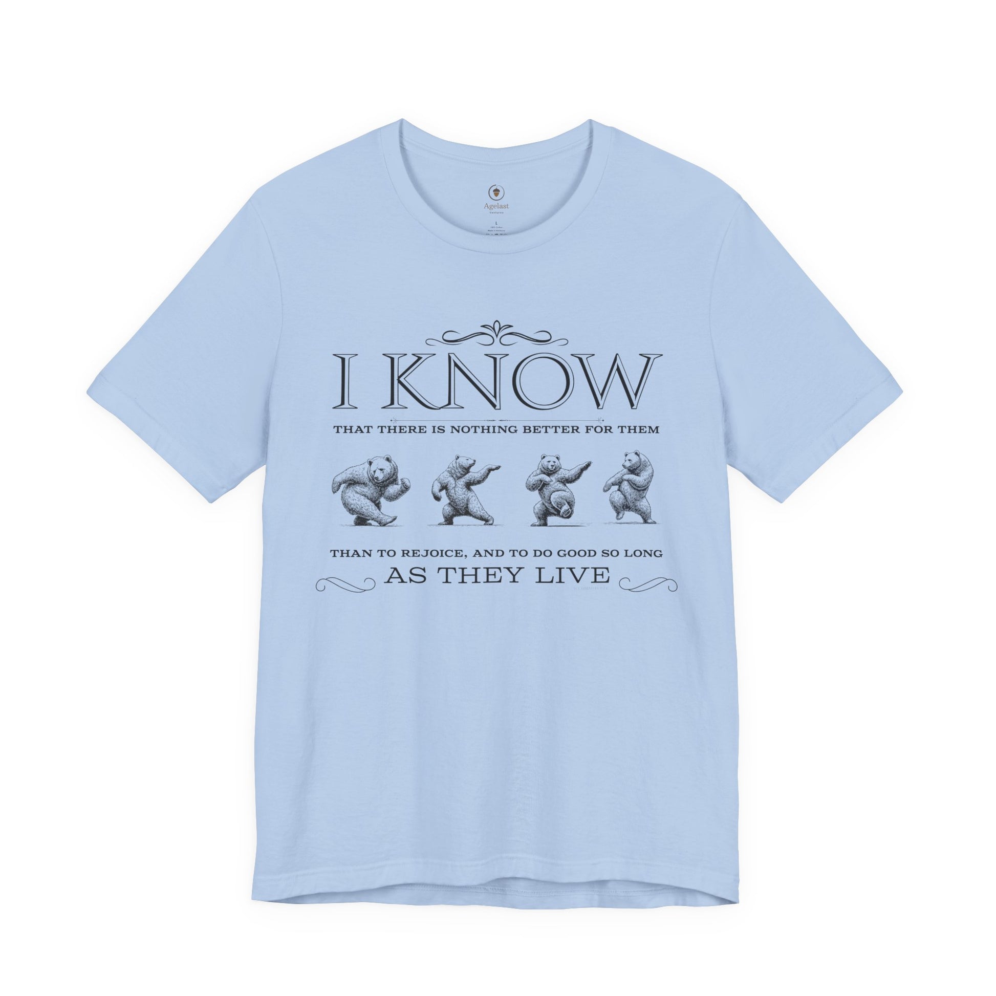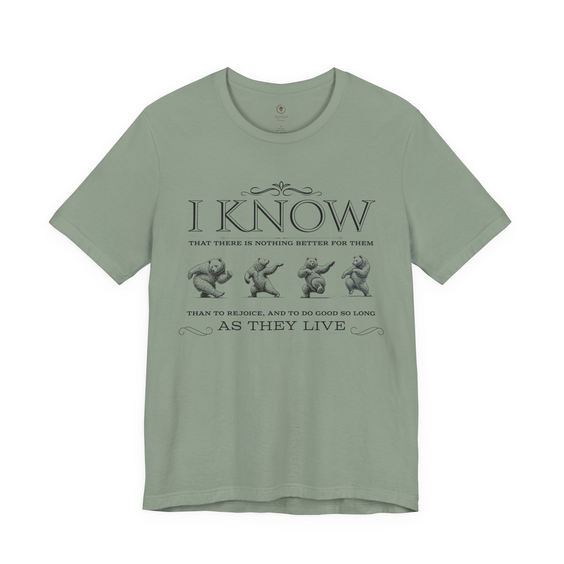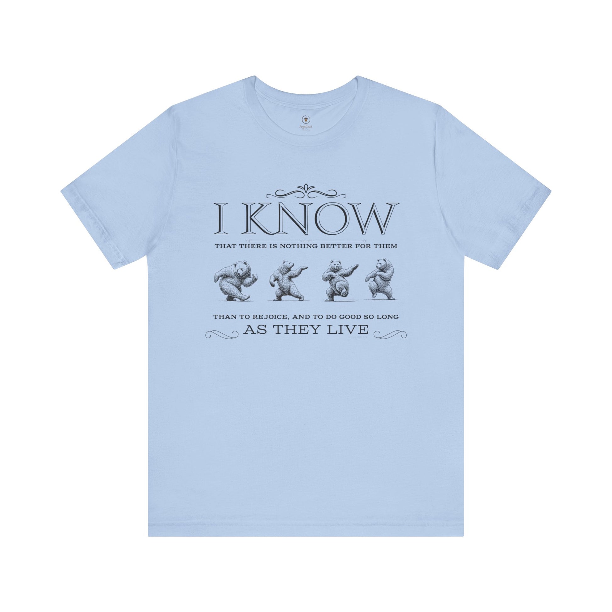 Ecclesiastes 3:12 -- As long as you are alive you have the opportunity to rejoice and do good. You don't have to -- but you have that option. This shirt is ideal for those who enjoy sparking conversations and sharing their faith, and for those who connect with our joyful ursine friends. What's more fun than a sleuth of bears prancing across your chest? This shirt gives off a casual and laid-back vibe, perfect for everyday wear or informal gatherings. Also great for formal events (if you think you can get away with it).