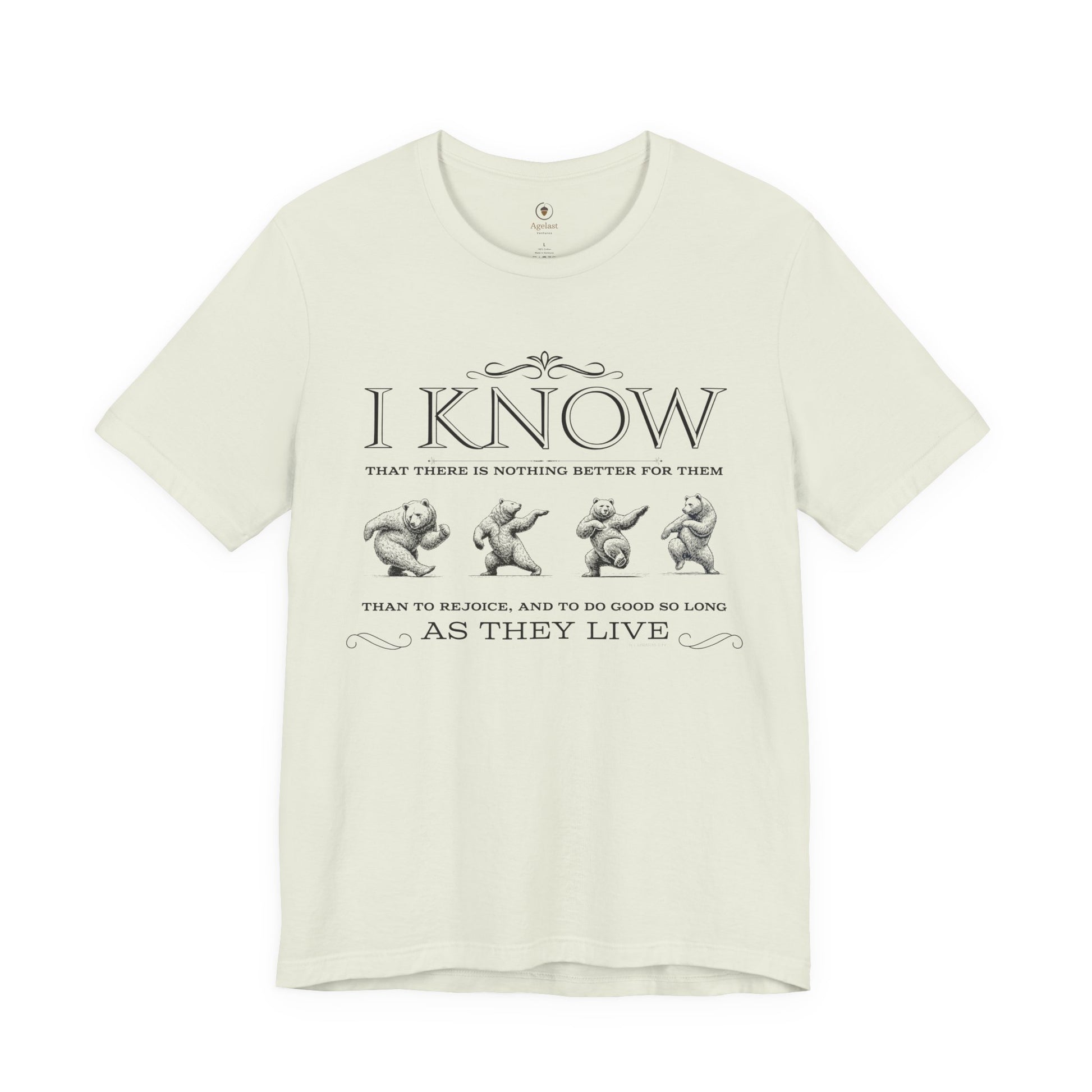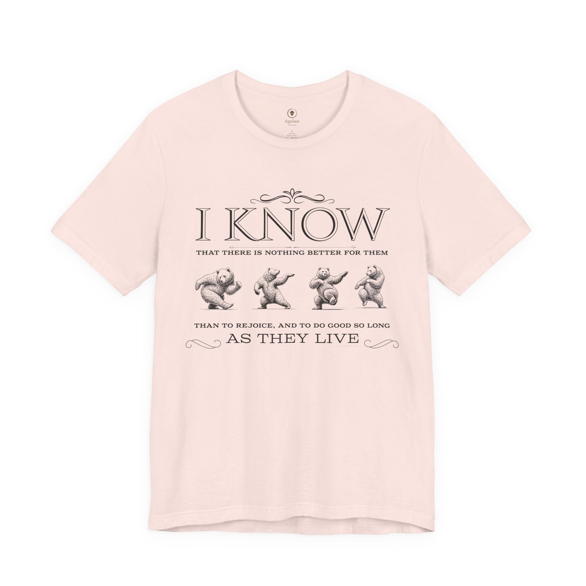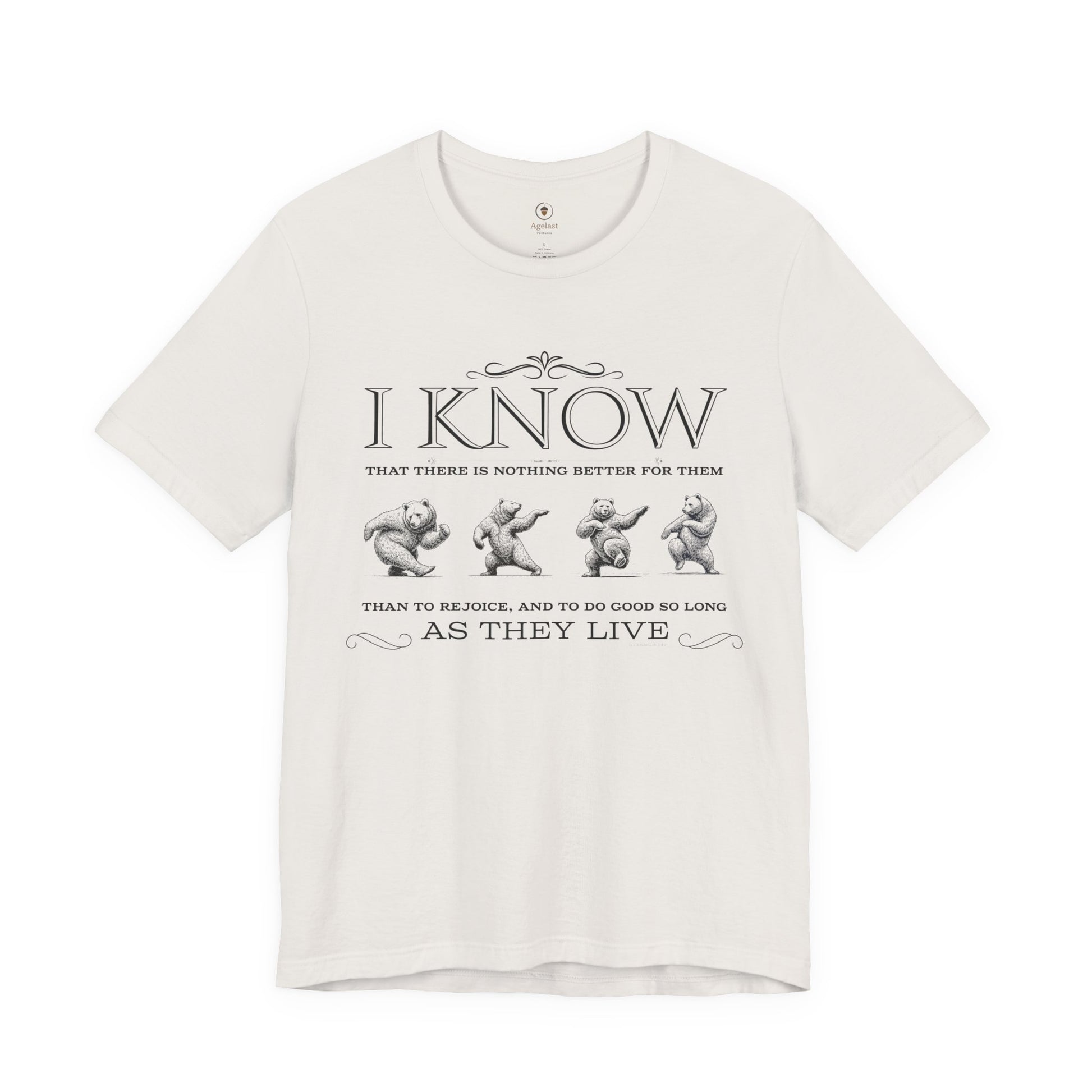 Ecclesiastes 3:12 -- As long as you are alive you have the opportunity to rejoice and do good. You don't have to -- but you have that option. This shirt is ideal for those who enjoy sparking conversations and sharing their faith, and for those who connect with our joyful ursine friends. What's more fun than a sleuth of bears prancing across your chest? This shirt gives off a casual and laid-back vibe, perfect for everyday wear or informal gatherings. Also great for formal events (if you think you can get away with it).