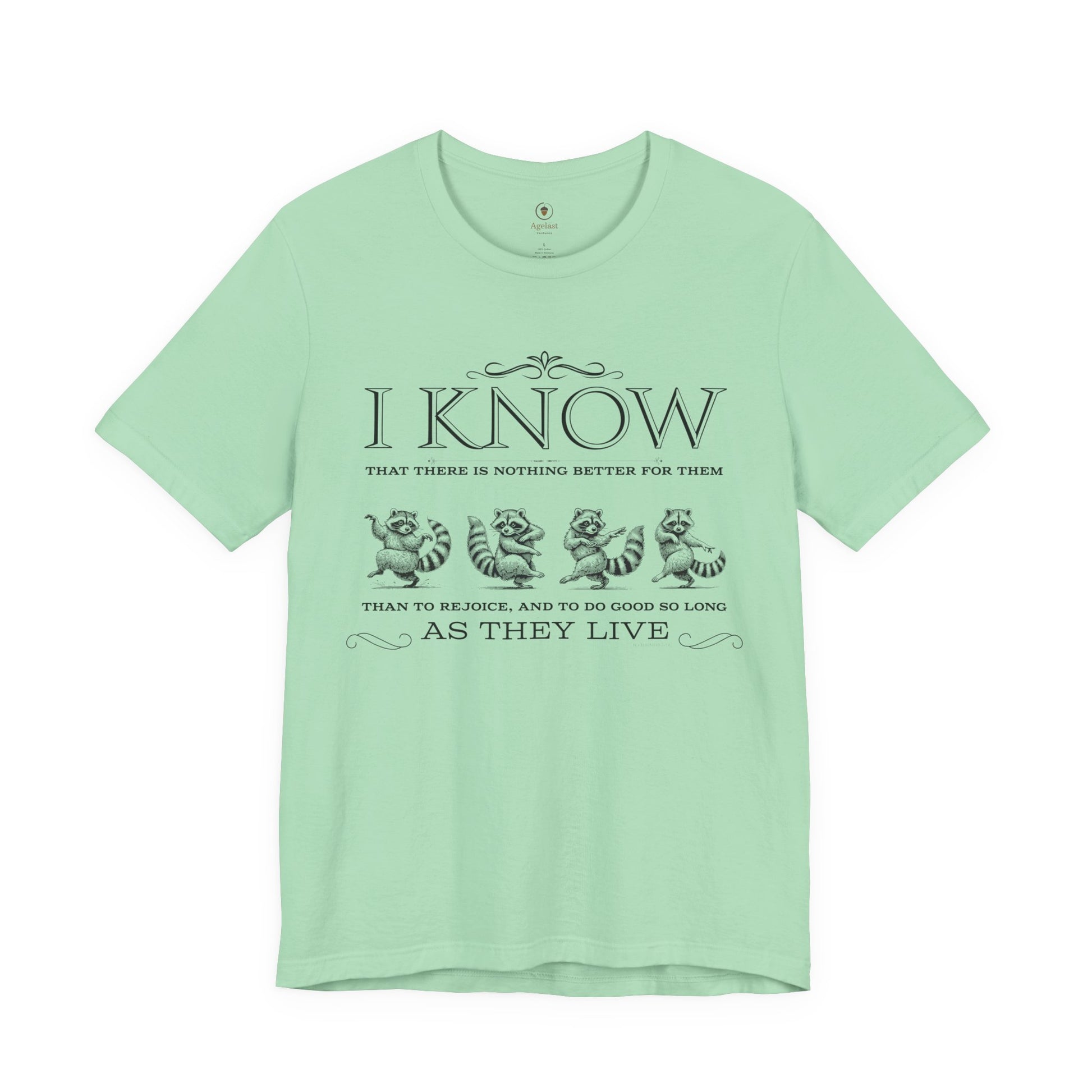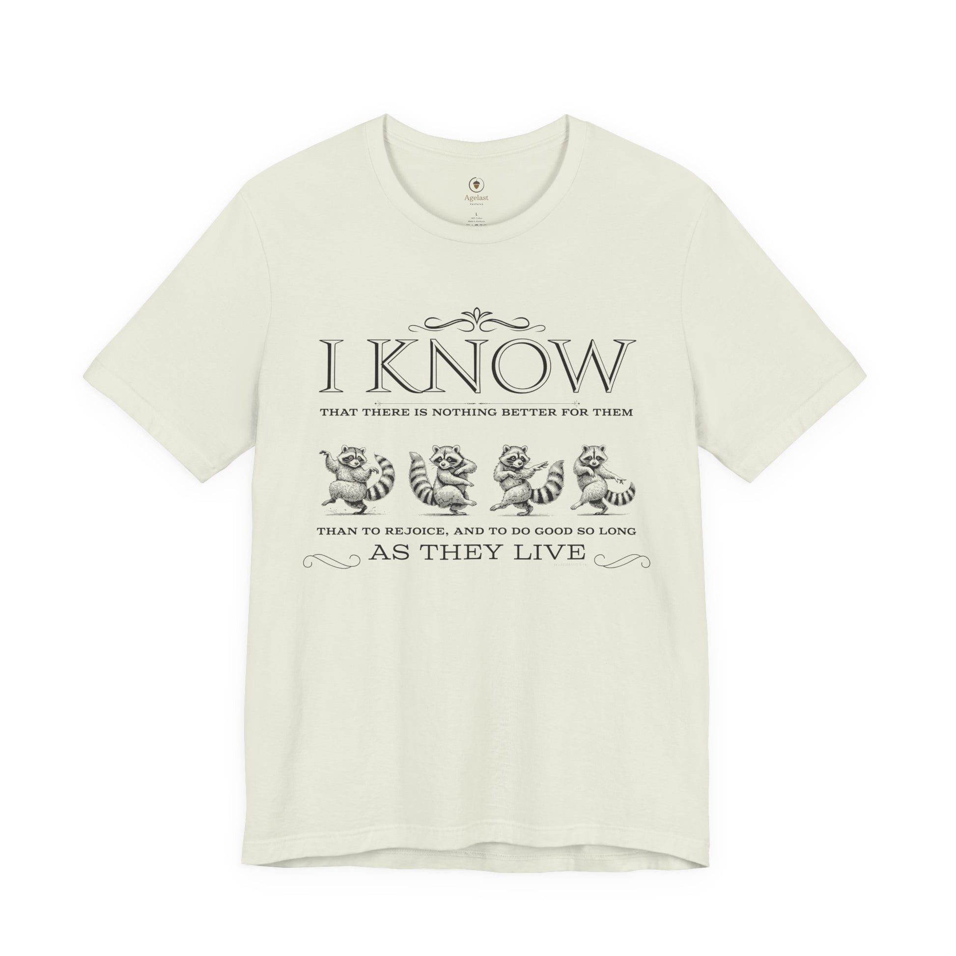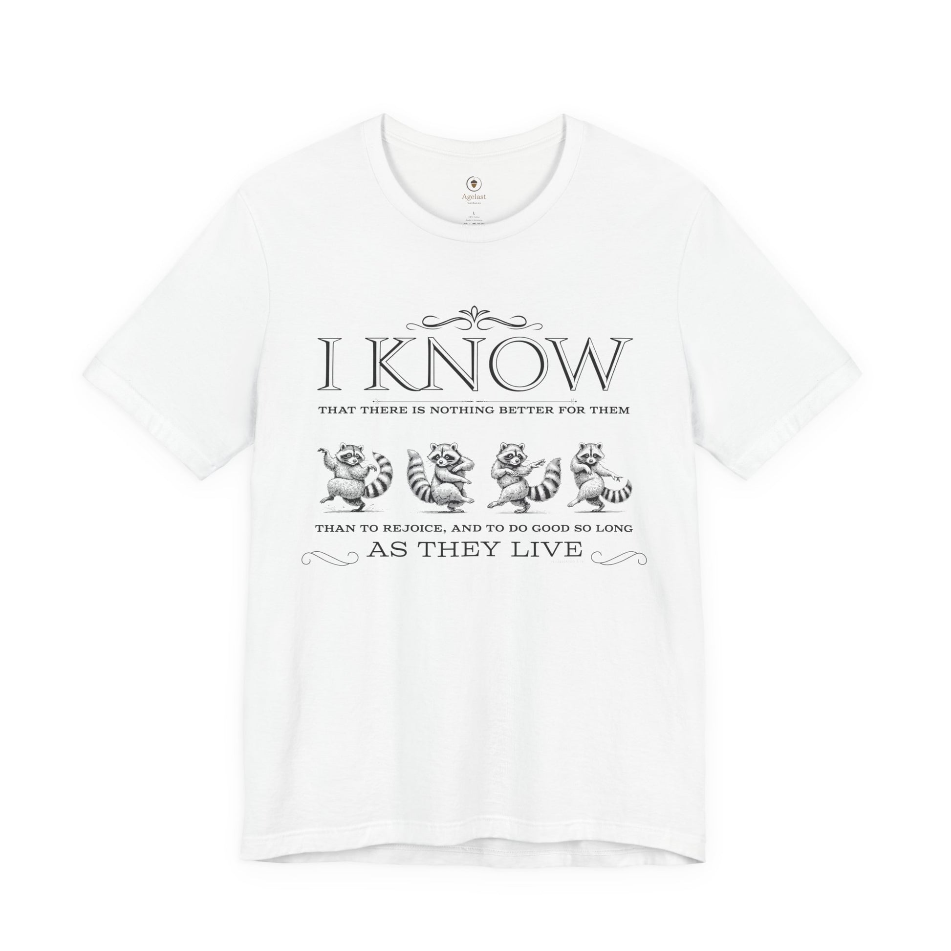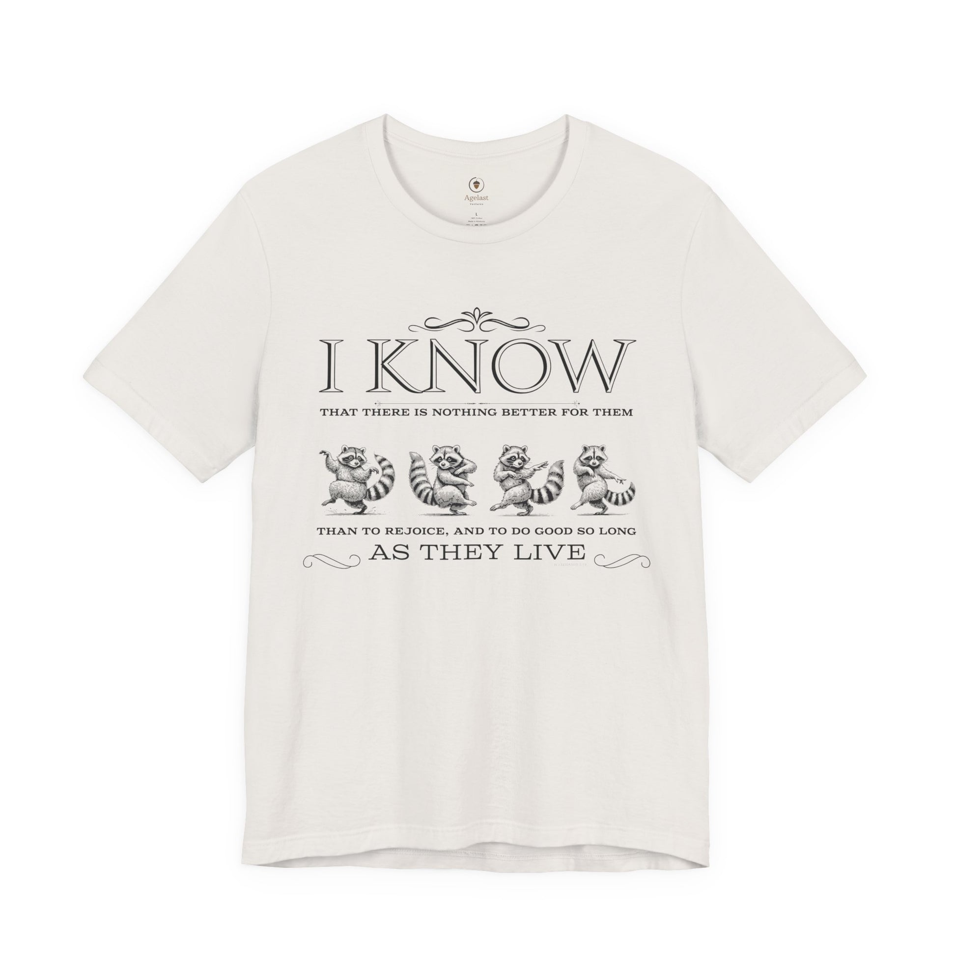 Ecclesiastes 3:12 -- As long as you are alive you have the opportunity to rejoice and do good. You don't have to -- but you have that option. This shirt is ideal for those who enjoy sparking conversations and sharing their faith, and for those who connect with joyful raccoons (and/or washing bears, dumpster pandas, and forest bandits). This shirt gives off a casual and laid-back vibe, perfect for everyday wear or informal gatherings. Also great for formal events (if you think you can get away with it).