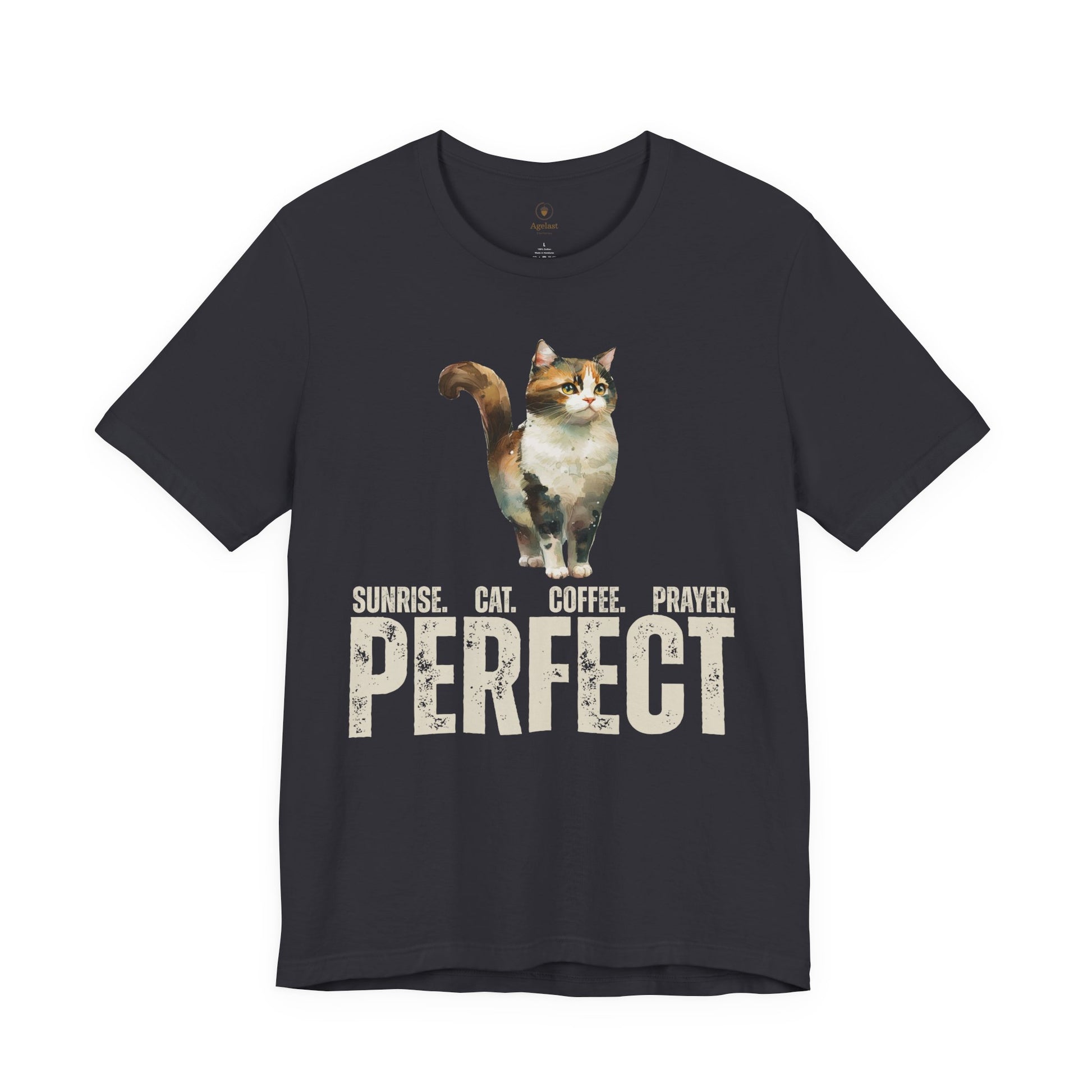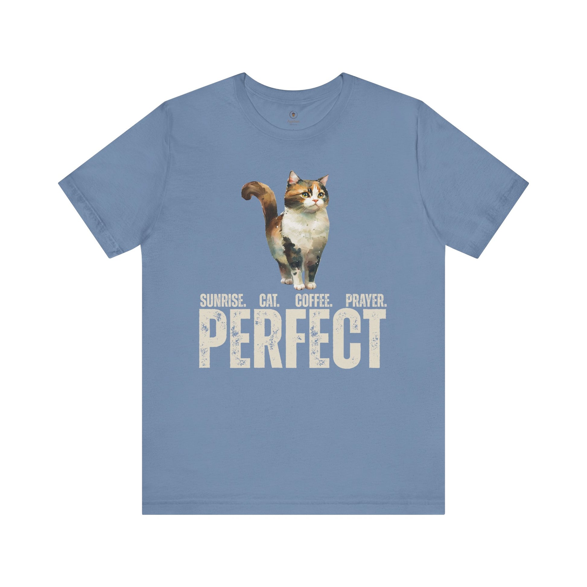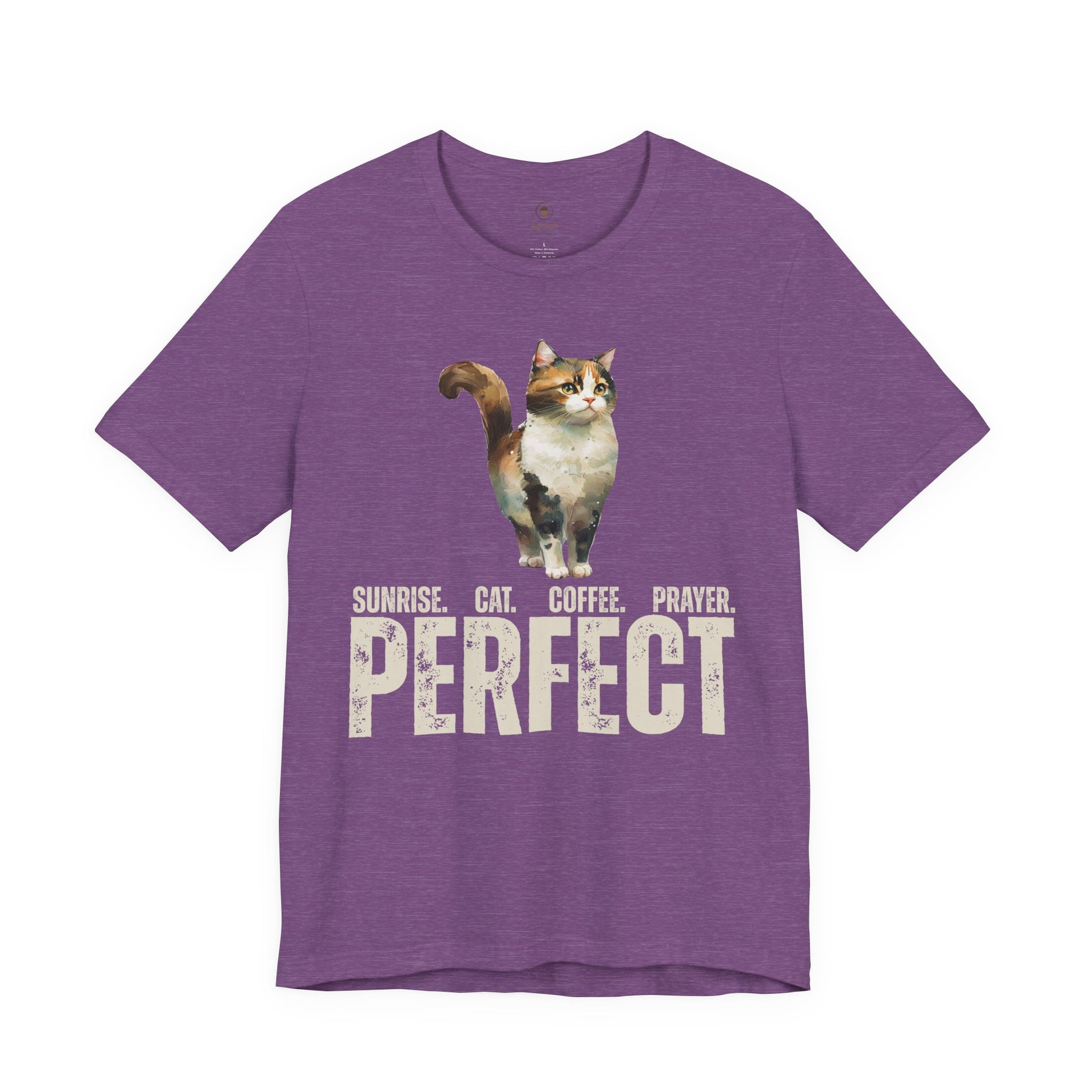 Sunrise with coffee, a feline companion, and prayer. Ideal for those who enjoy sparking conversations and sharing their faith, and/or discussing cats and prayer. This shirt gives off a casual and laid-back vibe, perfect for everyday wear or casual gatherings. Also great for formal events (if you think you can get away with it).