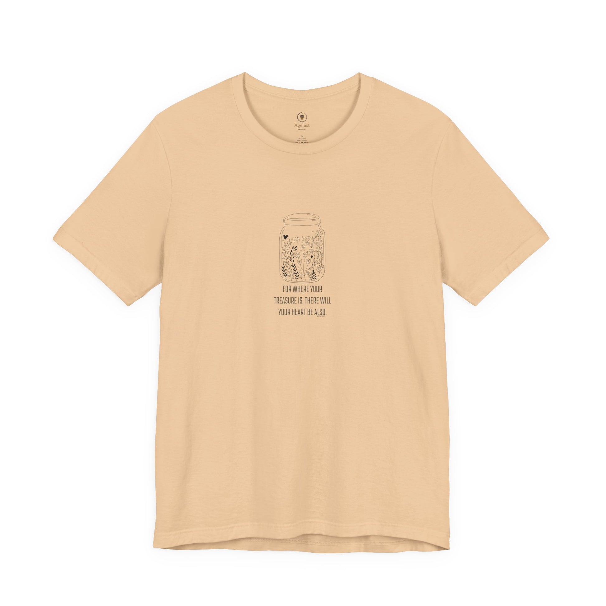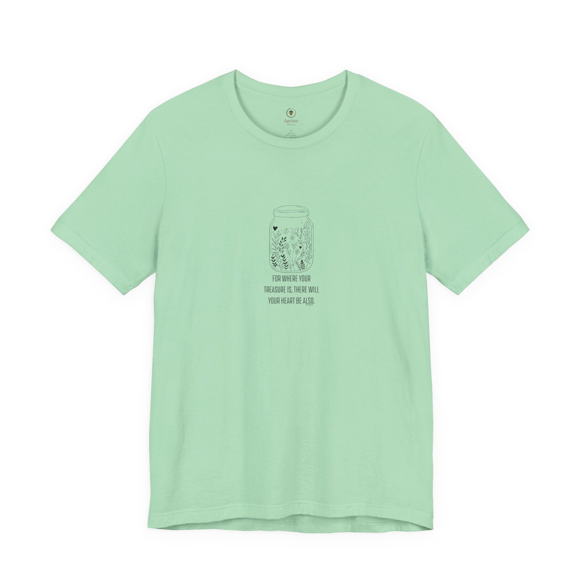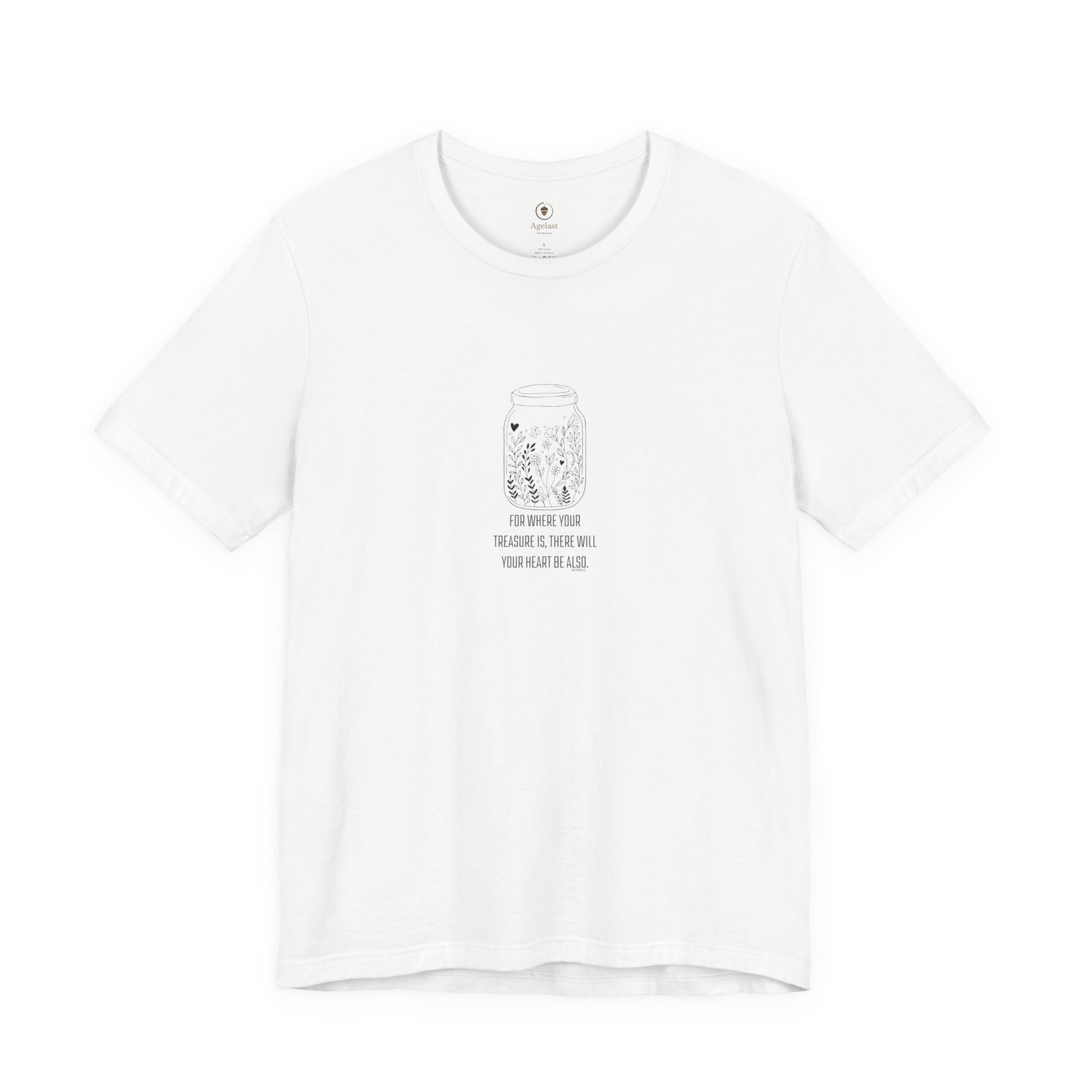 Matthew 6:21 -- Where your treasure is, there will your heart be also. Most people don't keep treasure in a Mason jar these days, but you never know. This shirt is ideal for those looking to strike up interesting conversations about earthly treasure and/or Mason jars and is perfect for casual events of any sort. Also great for formal events (if you think you can get away with it).